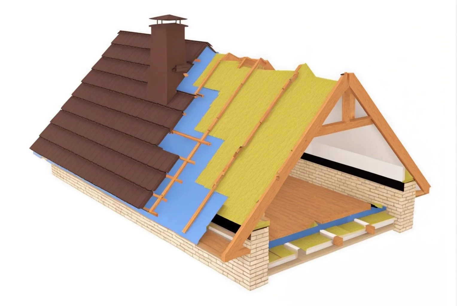 Каркасом скатной крыши дома служит стропильная система. Стропила монтируются с шагом от 600 до 1000 мм. Пространство между стропильными ногами при монтаже утепления полностью заполняется утеплителем, которым служит базальтовая теплоизоляция или изоляция из стекловолокна. Плотность используемой базальтовой теплоизоляции варьируется от 30 до 50 кг/м3.